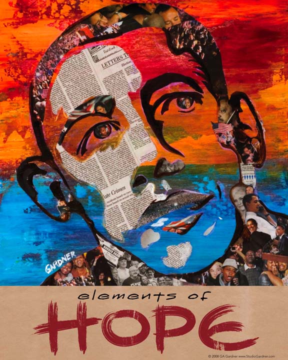 Your piece Elements of Hope was a collage featuring Barack Obama’s face. On your blog, you said that when you created the piece, you wanted to focus on an issue Obama neglected to talk about on the campaign trail: race. How did you tackle race in this piece? What were you saying that he didn’t say?